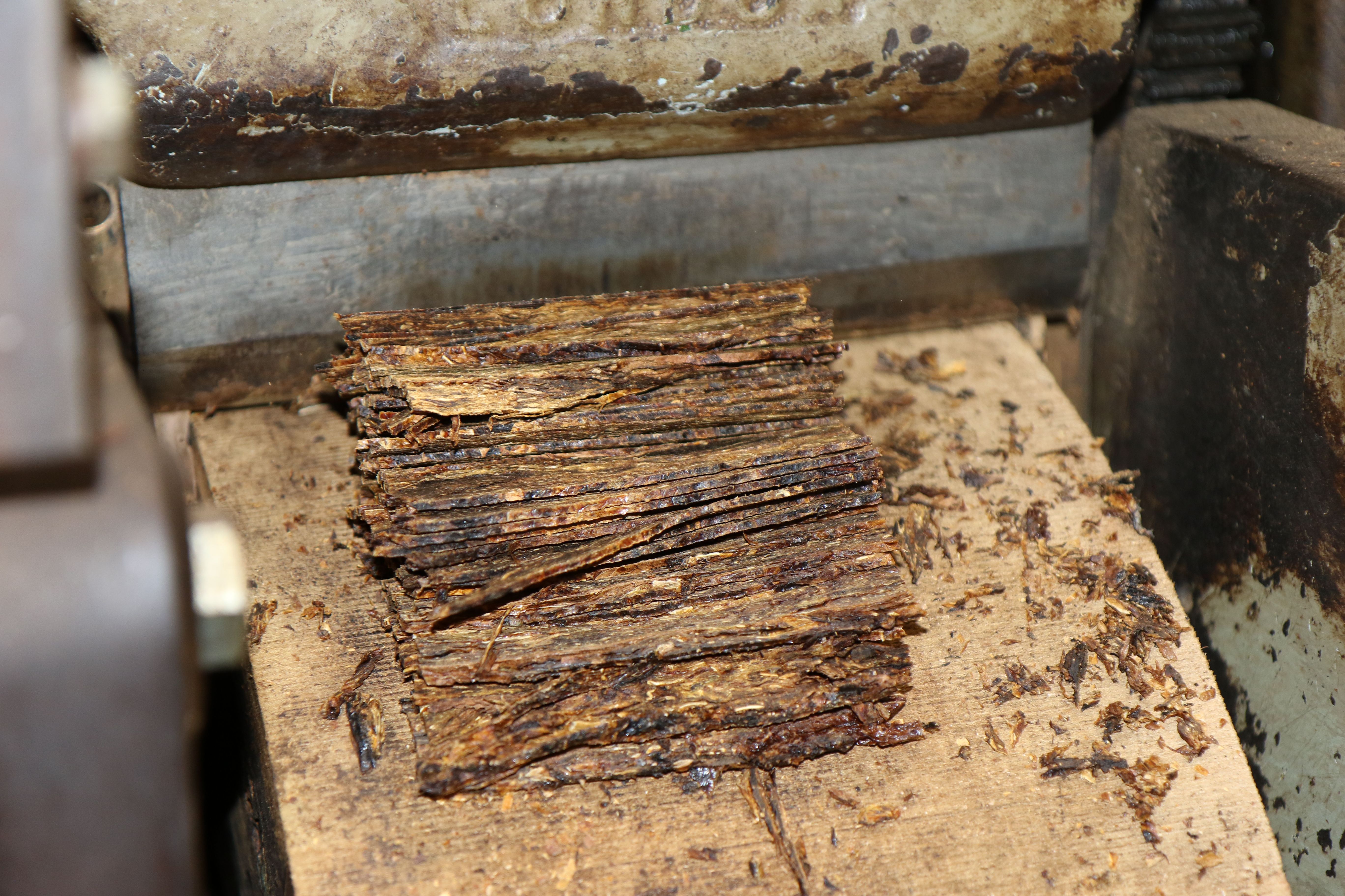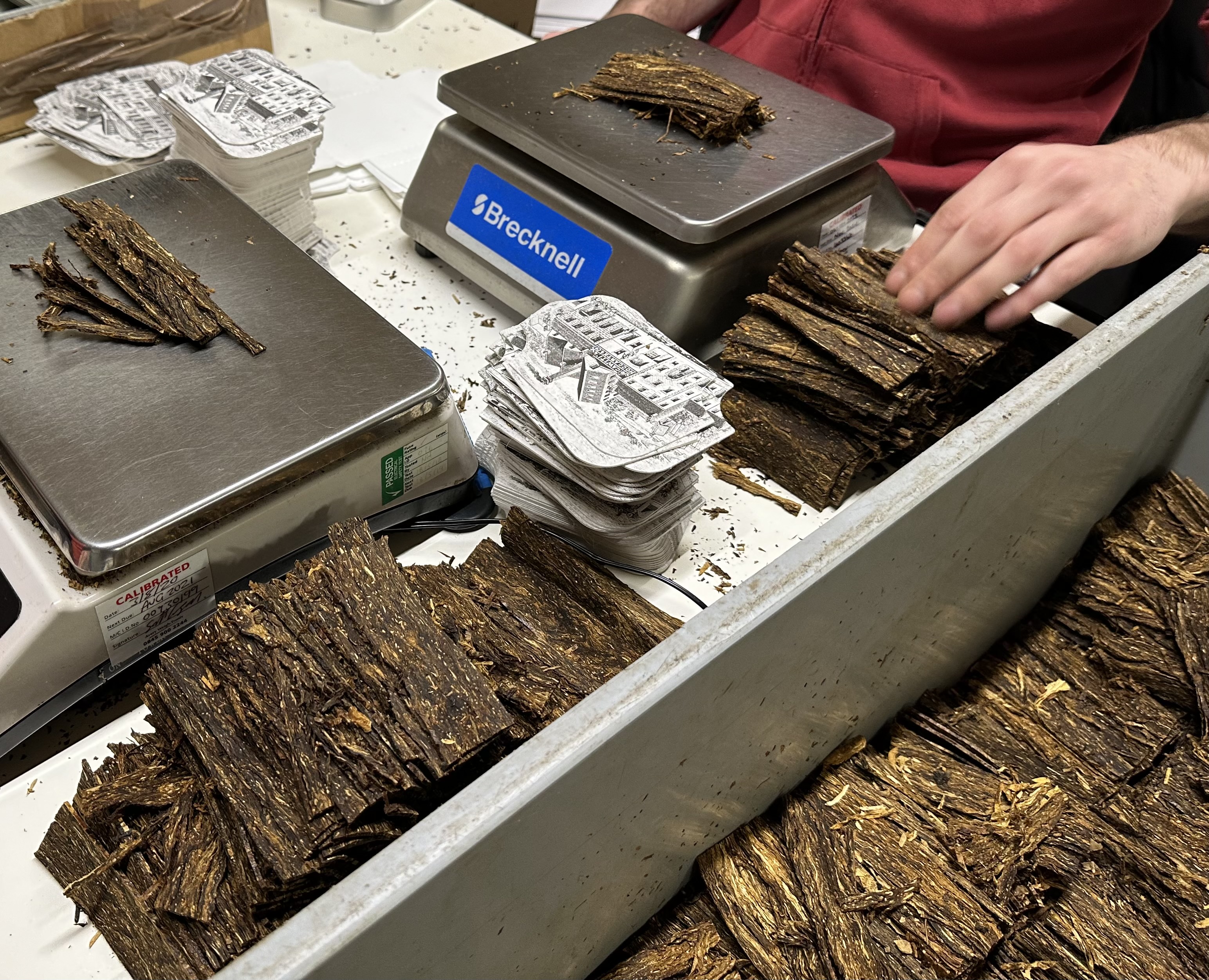 The cakes are then cut then cut to size and their edges trimmed off. At this stage you have a plug tobacco as it is essentially a flake pipe tobacco before it's been cut into flakes. These highly condensed bricks of solid tobacco are then cut into smaller blocks or pieces (cut plug) and then packed by hand.