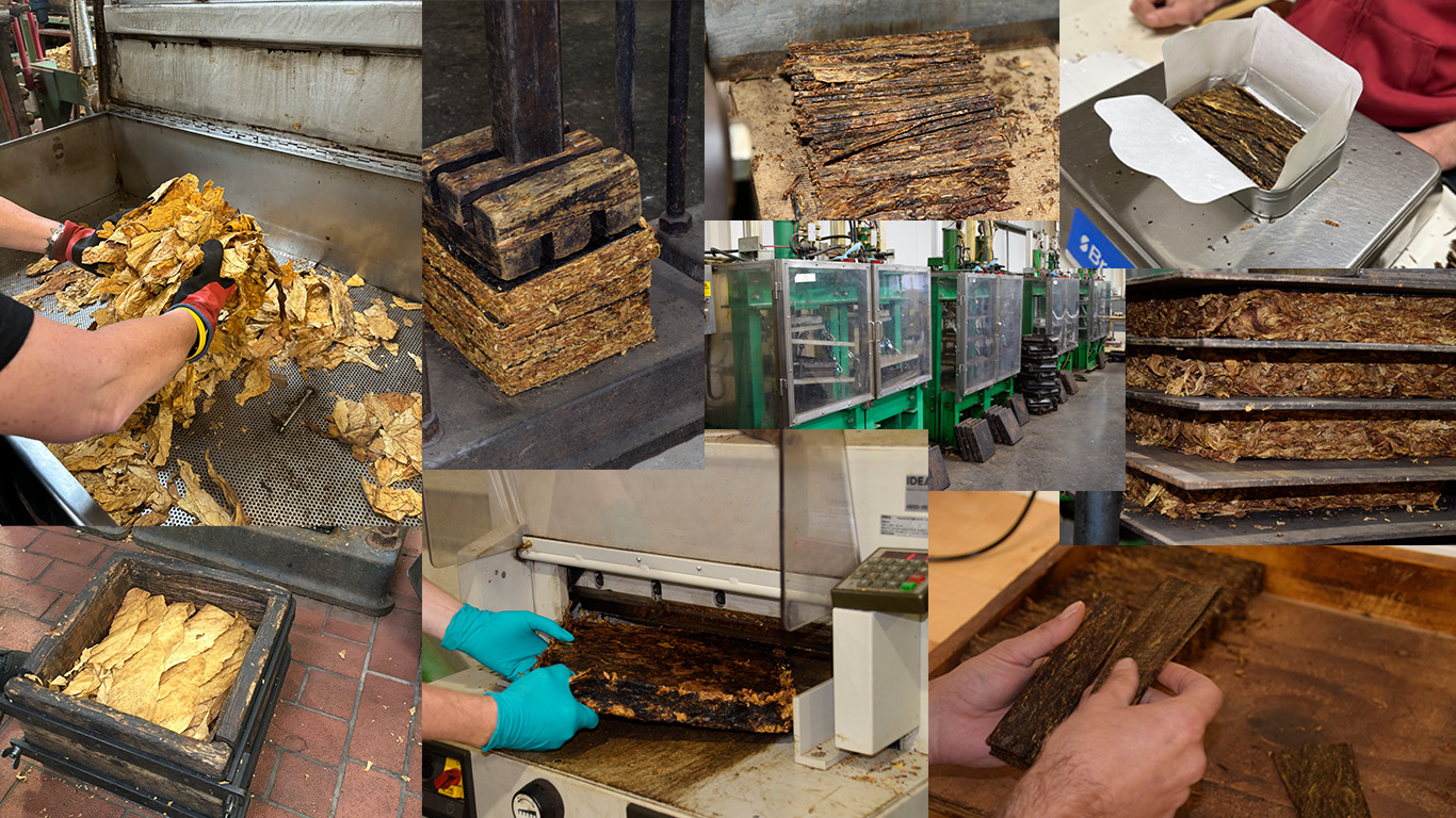 Pressing the whole leaf tobacco and holding it under pressure for a period of time allows the flavour profile of the blend to meld and mature, becoming something different from the individual leaf types, you find in a ribbon-cut tobacco and giving a more robust taste.