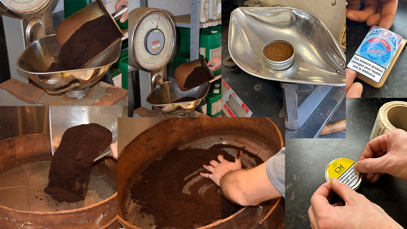 Blending, scenting and packing was done at Lowther Street. There were 9 basic bases made from various leaf compositions to give light, medium and dark snuffs, coarse and fine and then around 60 to 70 finished snuff flavours were made at Lowther Street, mixing various oils together and usually sieving the snuff at least 5 times during the blending and scenting process. The snuff would then be packed into various size tins for sale.