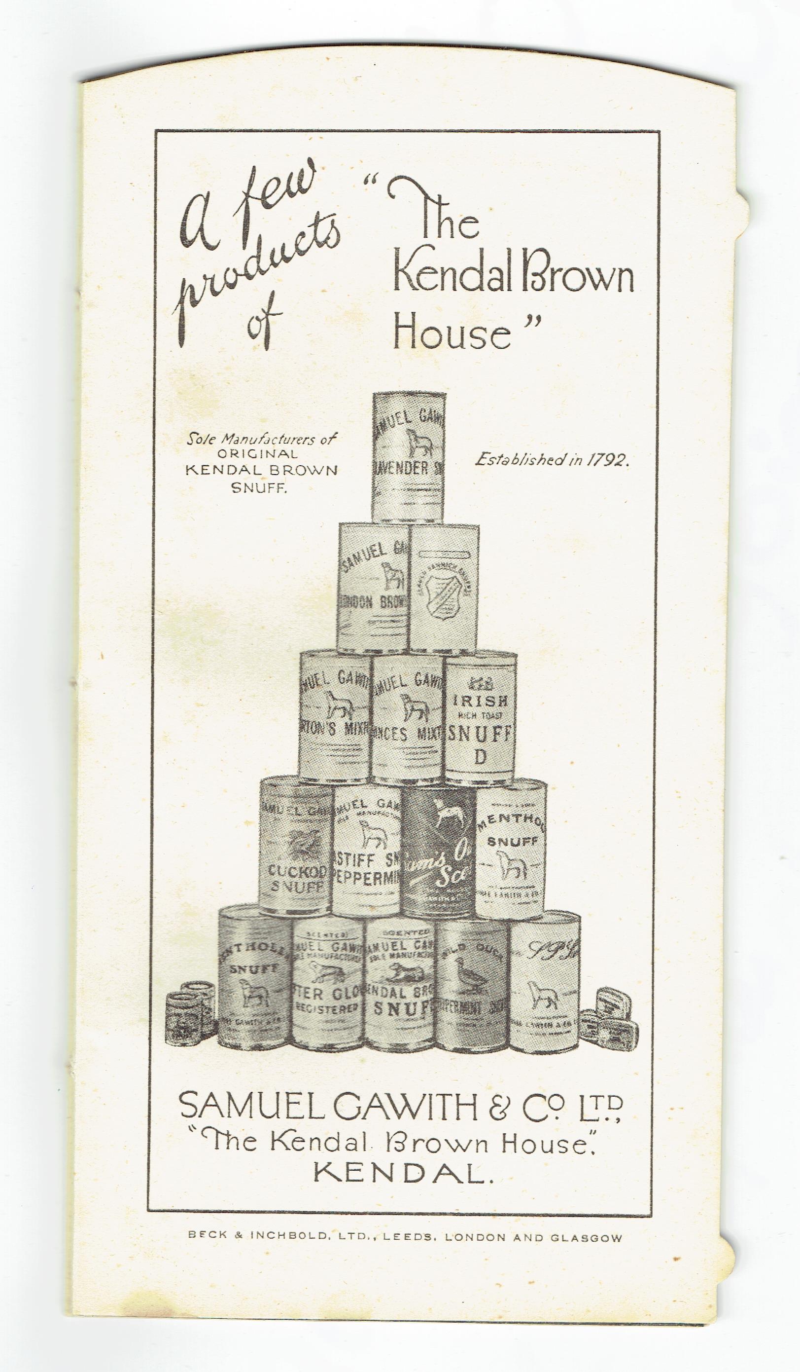 In the 1920’s Samuel Gawith made some 65 different brands of snuff including Doctor Verey’s, Golden Glow, After Glow, Mastiff and of course variations of the Kendal Brown.