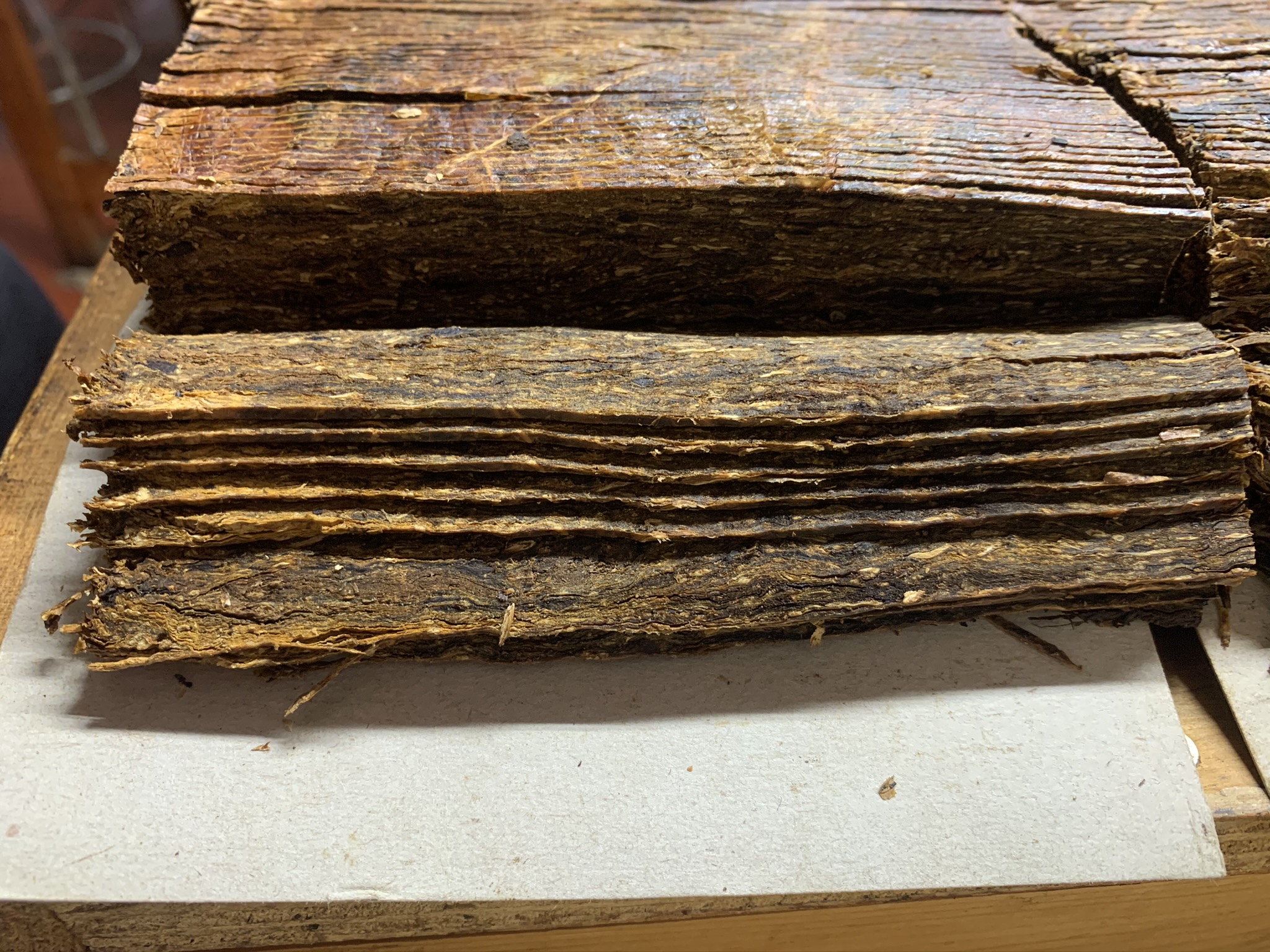 The cakes are then cut to size and either left as large pieces to sell as plug or sliced into thin flakes using very old guillotine type cutters, before being carefully packed by hand.