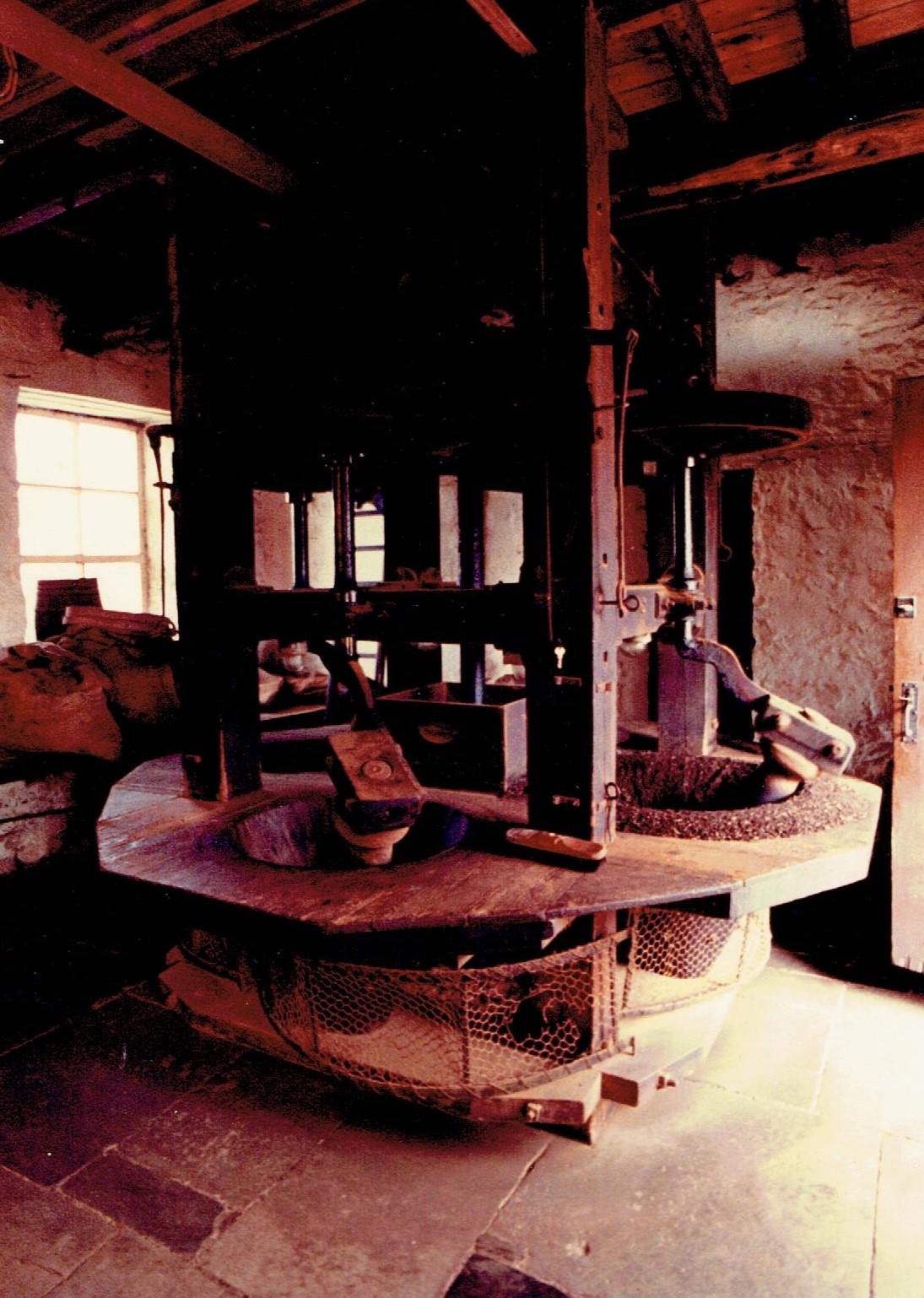 The main mill building was one large room housing the pestle and mortar mills, the revolving drum mills, an iron mixing pot and sieves. The large pestle and mortar mills consisted of four wooden mortars, each having a single pestle and was used to grind the coarser, damper snuffs and then there were two revolving drum mills for the fine dry snuffs. In the latter, the tobacco was ground to a fine dry powder using 28 steel balls of differing sizes which were put in the drums and would move around as the drum rotated.